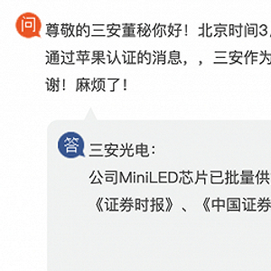 3月4日,三安光电在投资者互动平台表示,公司Mini LED芯片已批量供货客户。尽管三安光电没有具体点明客户名称,但上海财联社结合供应链消息分析认为,随着Mini LED屏幕搭载需求量大增,苹果正在积极新增供应商三安光电以巩固Mini LED屏幕的量产规模。
