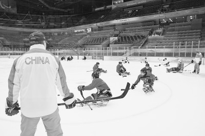 3月1日,中国残奥冰球队球员在训练中。当日,中国残奥冰球队在国家体育馆训练,备战北京冬残奥会。新华社发