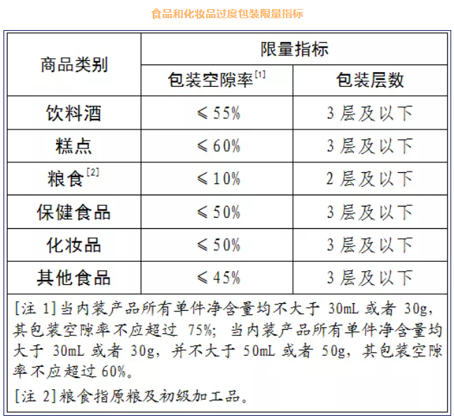 新标准中涵盖31类食品、16类化妆品,规定了包装空隙率、包装层数和包装成本要求,以及相应的计算、检测和判定方法。具体内容包括: