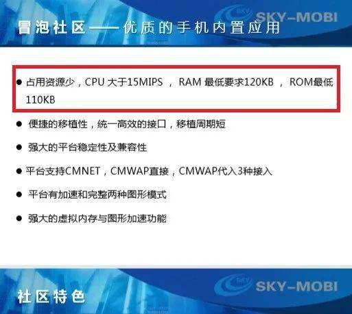 斯凯就是抓住了山寨机市场,为其提供“中间件”,让它们也能跑各种软件和游戏,通常是 mrp 格式。这是它的神奇所在,从一份斯凯公司业务介绍 PPT 上,我们可以看到斯凯冒泡软件平台的最低配置要求: