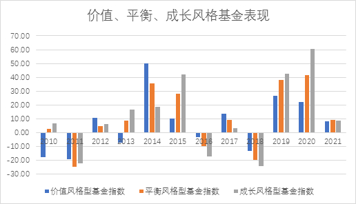 从投资风格来看,A股市场风格、领涨板块不断切换,相应地,不同风格的基金在不同时间段也表现不一。如下图所示,2012年、2014年、2016、2017年价值风格基金占优,而2013、2015、2019、2020年成长风格又明显占优。