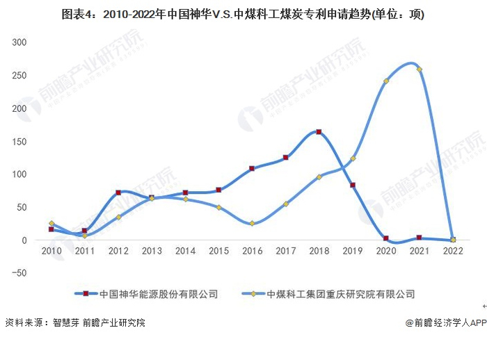 从趋势上看,2010-2021年,中国神华和中煤科工在煤炭专利申请数量上呈现“你追我赶”的趋势。2021年,中国神华和中煤科工公司的煤炭专利申请数量分别为3项和259项。