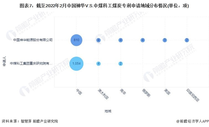 目前,中国神华和中煤科工的煤炭专利申请区域主要集中在中国。截至2022年2月20日,中国神华和中煤科工在中国的专利申请数量分别为810项和1054项。