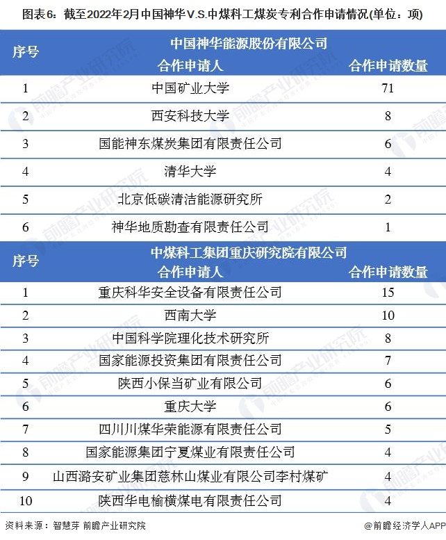 (3)专利合作申请对比:中国神华合作申请较多,中煤科工合作主体较广