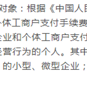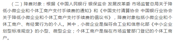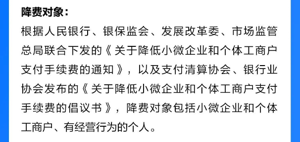 从降费对象来看,包括小微企业和个体工商户、有经营行为的个人。简单来说,就是小微企业、个体工商户、有经营行为的个人等符合条件的用户,有支付服务费用,并打9折优惠,个人收款码提现继续免费。