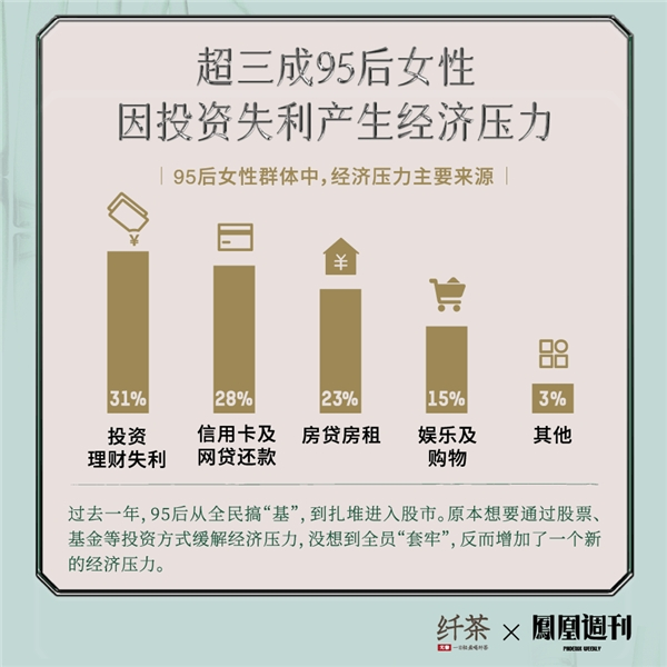 《报告》显示,经济压力是95后女性的最大压力来源,28%的受访者对经济问题感到焦虑。其中,31%的95后女性遭遇到投资、理财失利。