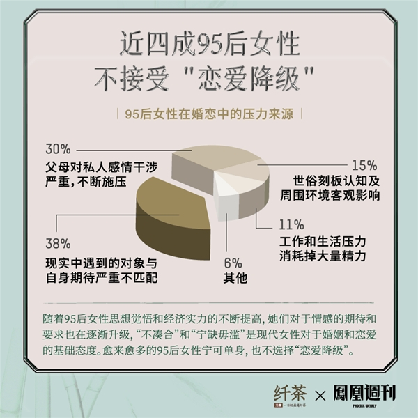 随着95后女性思想觉悟和经济实力的不断提高,她们对于情感和婚姻的期待也在逐渐升级。近四成95后女性不接受“恋爱降级”,在面对职场竞争、社会生存等问题的同时也不愿意在恋爱上将就自己,选择“先爱自己”。现实中遇到的对象与期待不匹配、父母施压、世俗刻板印象,以及工作生活压力消耗大量精力,成为她们在婚恋上的压力源头,分别占比38%、30%、15%、11%。