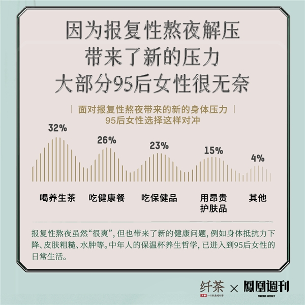 为了对冲这些新产生的健康压力,95后女性往往通过养生行为来进行对冲,32%的95后女性选择喝养生茶,26%和23%的女性则选择吃健康餐和保健品,还有15%的女性认为护肤品可以弥补熬夜损伤。