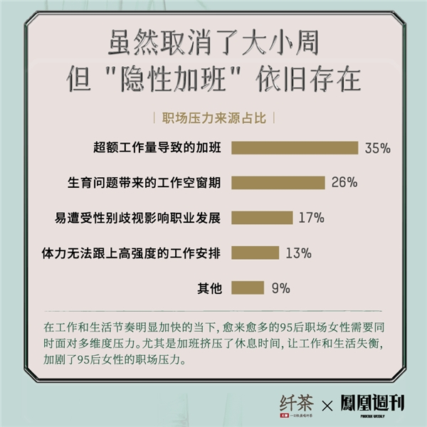 在工作和生活节奏明显加快的当下,越来越多的95后职场女性需需要同时面对多重压力。虽然取消了大小周,许多人依旧要面对“隐性加班”,还有生育带来的工作空窗期、职业发展中的性别歧视,以及体力问题成为她们担忧的问题,数据分别占比35%、26%、17%、13%。