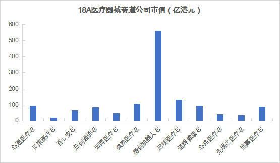 再看医疗器械赛道,该赛道企业主要专注于血管介入、神经外科、非血管介入、糖尿病、诊疗设备、分子诊断等领域。截至2021年12月31日,医疗器械赛道共20家公司,已上市公司有12家,递表有8家。18A医疗器械子赛道的12家企业整体总市值为1,370.5亿港元,市值均值为114.2亿港元。市值过50亿港元的有8家,占比66.7%;市值过100亿港元的有3家,占比25.0%;市值过500.0亿港元的有1家,占比8.3%。在医疗器械赛道中,整体来看,企业市值表现差异较大。其中,微创机器人总市值为561.3亿港元,位居榜首,占比医疗器械总市值高达41.0%,其市值超过2~6名的市值总和。
