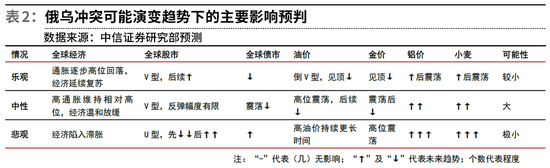 按照中信证券对俄乌冲突可能存在的几种演变趋势预判:乐观情况下,拐点已至,紧张气氛即将结束,但鉴于当前俄罗斯出兵形势,该情况出现的可能性较小;中性情况下,乌东地区爆发一定规模的正面代理人冲突,整个事件持续数周,该情况出现的可能性较大;悲观情况下,冲突升级为区域性战争,整个事件延续数月以上,但鉴于本次事件“天花板”已明、西方对俄资源的依赖等原因,该情况出现的可能性极小。