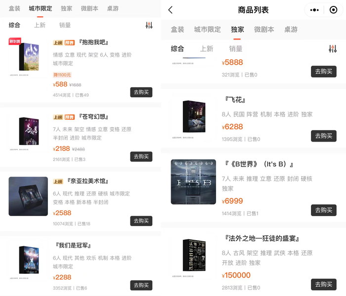剧本杀发行小北告诉界面文娱,店家获得新剧本的途径是每个月在各个城市举办的“展会”或是一些线上的平台。在剧本杀发行平台“黑探有品”上,一个“独家”本的价格大多在4000元至7000元,最贵的一个剧本价格高达15000元;一个“城限”本的价格大多在2000至3000元,也有少数仅需要500元至700元;“盒装”本的价格则基本在700元以下。