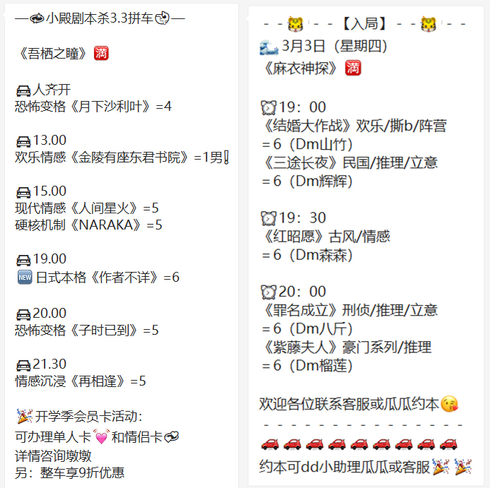 部分线上剧本杀群聊中的“拼车”信息,“=4”意为还缺4名玩家。