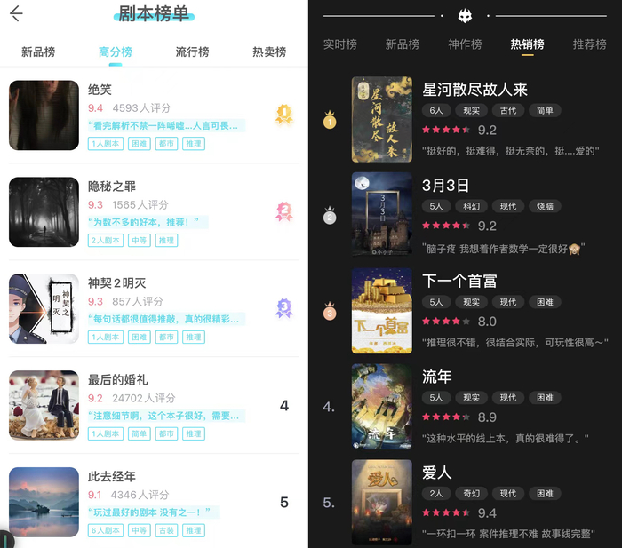 根据剧本的质量,剧本杀被分为“独家”“城限”和“盒装”三个档次。其中,“独家”本每个城市只有一家剧本杀店能够获得授权,“城限”本每个城市能够获得授权的门店为3家,“盒装”本则不限数量。