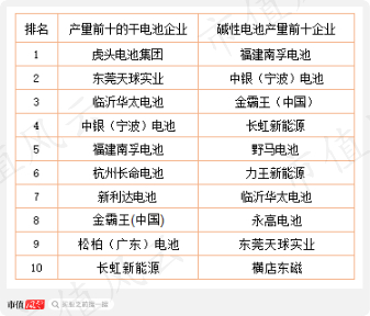 中国电池工业协会统计显示,2019年产量前十的干电池企业、碱性电池企业包括东莞天球实业、南孚电池、中银电池、长虹能源等。