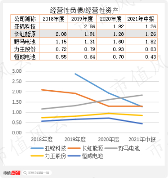 经营性负债与经营性资产的比值来看,亚锦科技、长虹能源、野马电池均超过高于1,说明这三家公司在供应链中相对强势,能占到供应商和客户的便宜;而力王股份、恒威电池低于1,在供应链中议价能力较弱。