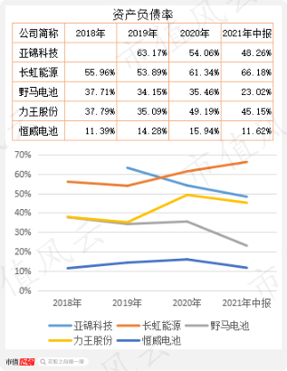 与之形成鲜明对比的是,野马电池负债率在2021年6月末大幅下降,主要原因是其在2021年3月份上市募资5.4亿元。