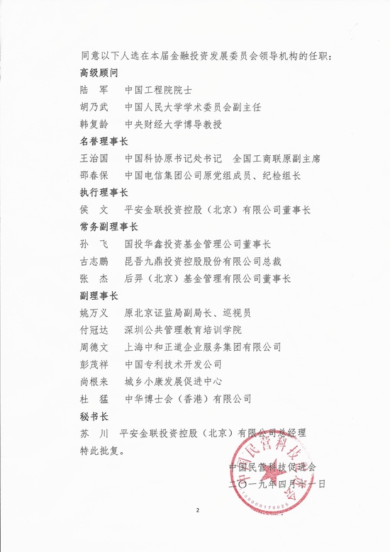 判决书显示,平安金联成立于2010年3月,其曾用名为“北京海顿诺达管理咨询有限责任公司”,2015年4月更名为现公司名称。其经营范围包括项目投资;投资管理;投资咨询等。域名为stdaily.com及cappse.org.cn的中国科技网及中国民营科技促进会网站,分别发布了名为《中国民营科技促进会金融投资发展委员会在京召开》《中国民营科技促进会金投委成立大会在北京成功举办》的文章,发布时间为2019年4月。
