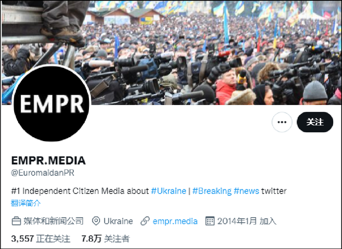 经检索,这条推文发布于北京时间3月6日中午,推特账号名为“EMPR.MEDIA”,自称为“关注乌克兰的独立公民媒体”,被推特认定为“媒体和新闻公司”。