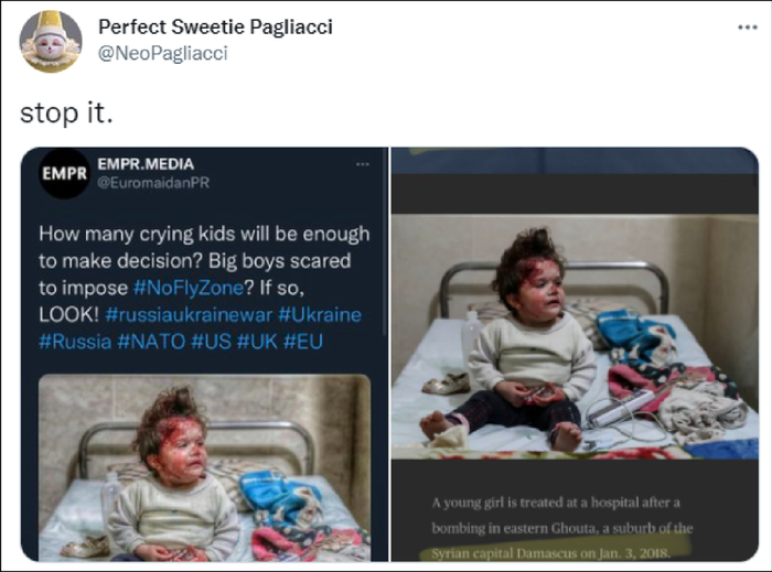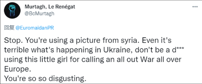 “给我住手,你正在使用来自叙利亚的图片!即使乌克兰发生的事情很糟糕,也不要利用这个小女孩让整个欧洲发生全面战争,你太恶心了。”