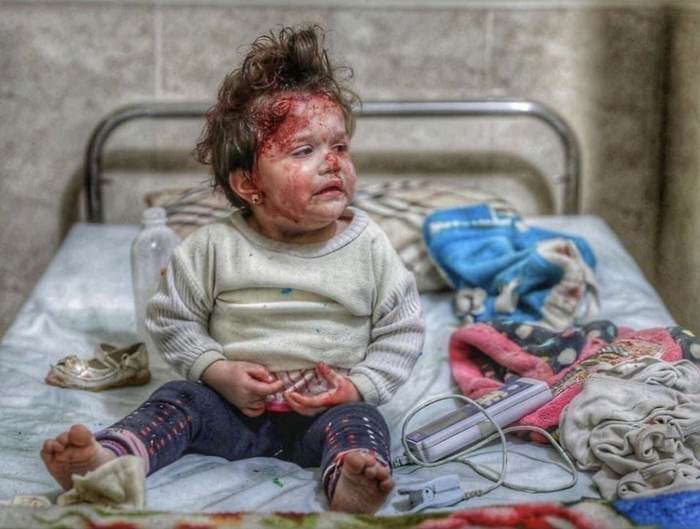 这条推文配上了一张极具冲击力的照片——一位满脸是血的儿童目光呆滞地坐在一张床上,旁边是散乱的衣物。