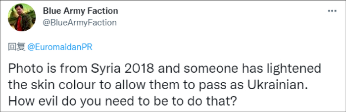 “这张照片来自2018年的叙利亚,有人把她的肤色调亮,让她以乌克兰人的身份取信于人,你是有多邪恶才能做出这种事的?”