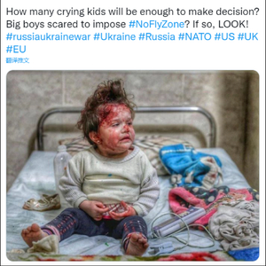 近日,推特上一条关于呼吁“在乌克兰设置禁飞区”的推文引发关注。该推文试图从“轰炸中受伤的儿童们”切入以博取人们的同情心,并配上了一张极具冲击力的儿童受伤照片。