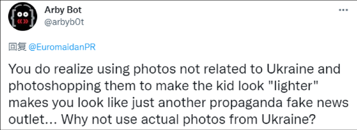 “你应该能意识到,使用与乌克兰无关的照片,并用PS让孩子看起来‘更亮’,只会让你看起来像是另一个宣传假新闻的媒体……为什么不使用乌克兰的真实照片呢?”