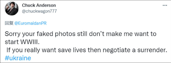 “真是抱歉,你的假照片还是没能让我支持开启第三次世界大战。如果你真的想拯救生命,那就(让乌克兰)协商投降吧。”