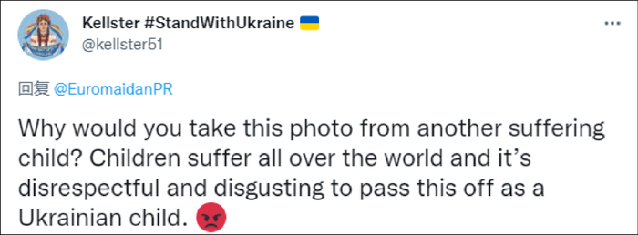 而且,就连在推特上自称支持乌克兰的用户,也对这条推文感到极其失望,认为这种用“另一个遭受苦难的儿童照片来冒充乌克兰儿童”的行为“令人作呕”。