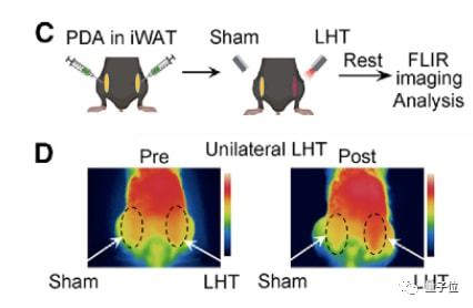 首先,用纳米水凝胶颗粒注射到小鼠腹股沟位置的白色脂肪中,在近红外光照射下,水凝胶可以把周围的脂肪组织加热到41° c左右。