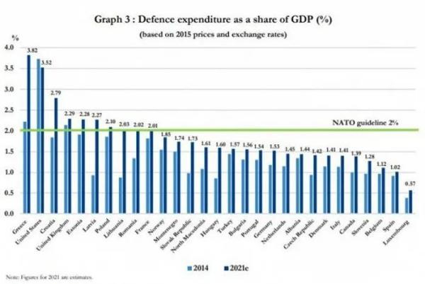 到2021年,完成2%目标的国家增至10个,新增五国分别为克罗地亚、波兰、立陶宛、罗马尼亚和法国。希腊成为国防开支占比最高的国家,达到gdp的3.82%。