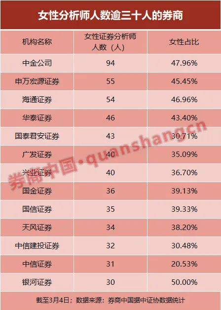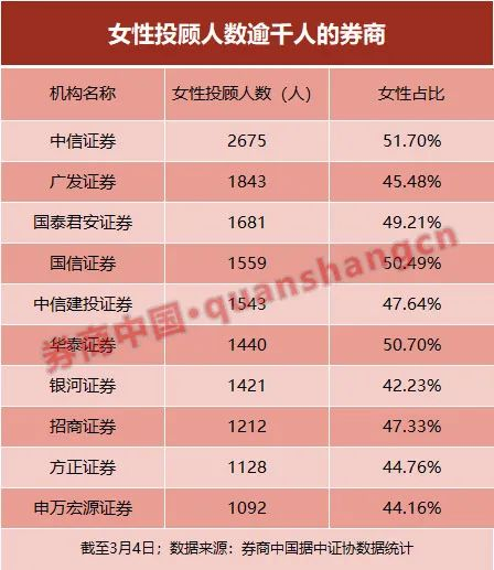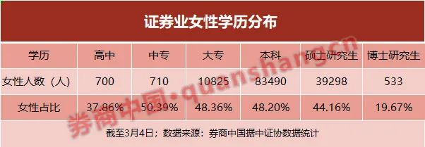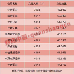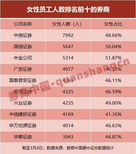 根据券商中国记者对中国证券业协会数据进行统计,截至3月4日,证券公司女性员工共有13.56万名,占比46.65%。