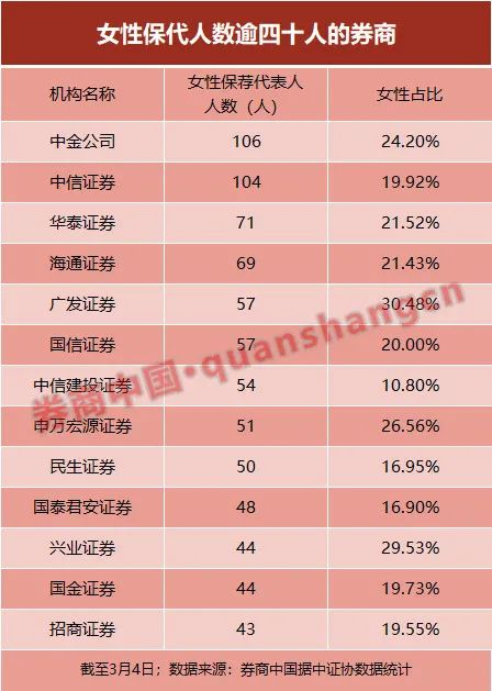 数据显示,中金公司和中信证券的女保代人数均超过百名,分别有106人、104人,依次占比24.2%、19.92%。保代总人数排名前三的中信建投,女保代只是占比10.8%。