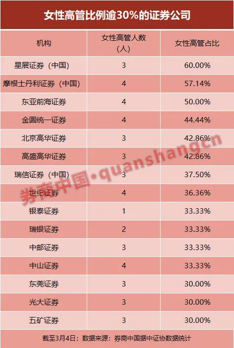 多达44家券商仅有1名女高管。仅有7家券商拥有4名女高管,分别为摩根士丹利证券(中国)、东亚前海证券、金圆统一证券、世纪证券、中山证券、天风证券、恒泰证券。