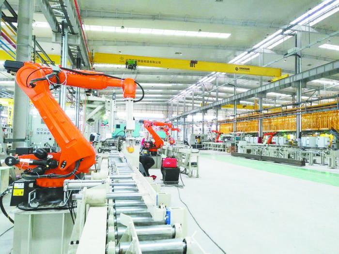 在山西建投装备制造有限公司型材下料自动化生产线上,机械臂上料码垛实现高度自动化。该生产线作为全国塔机行业领先的型材下料自动化生产线,在生产制造智能化、集约化、柔性化、绿色化、少人化等方面进行了一系列探索和实践,发挥了行业转型引领作用。