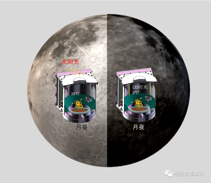 9天实验时间。此外,在月球上面做生物实验,不像拍照或是探测那样短时间就做完了。生命要有可以观测到的现象变化,至少要几天甚至几十天,但我们的时间最多只有9天。为什么是9天呢?因为月球的一个白昼是14天,但是嫦娥四号不可能在月球上白昼的第1天就着陆,为什么?因为温度太低,阳光太少,所以要等月面的温度比较柔和的时候才能够着陆。