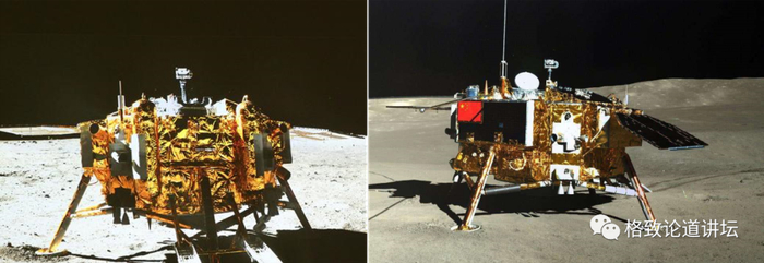 左:嫦娥三号,右:嫦娥四号。嫦娥四号是嫦娥三号的备份,前者的生产、设计、状态都跟后者一模一样。2013年,我国成功发射嫦娥三号,它携带月球车玉兔号着陆到月球上,这使我国成为世界上第三个软着陆月球的国家。这也意味着嫦娥四号在2013年就已经全部做完了,它的位置、空间全部都已布置完成。我们只能见缝插针地用仅有的3公斤重量、在200×200×200毫米的小空间做这个实验。