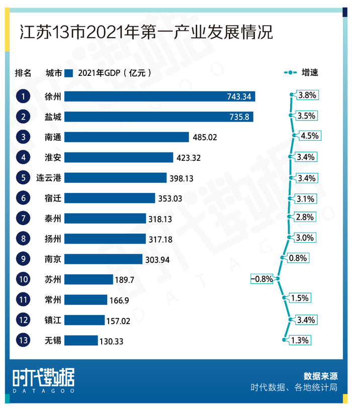 从第一产业增速来看,南通、徐州、盐城增速位居前三,分别为4.5%、3.8%、3.5%。