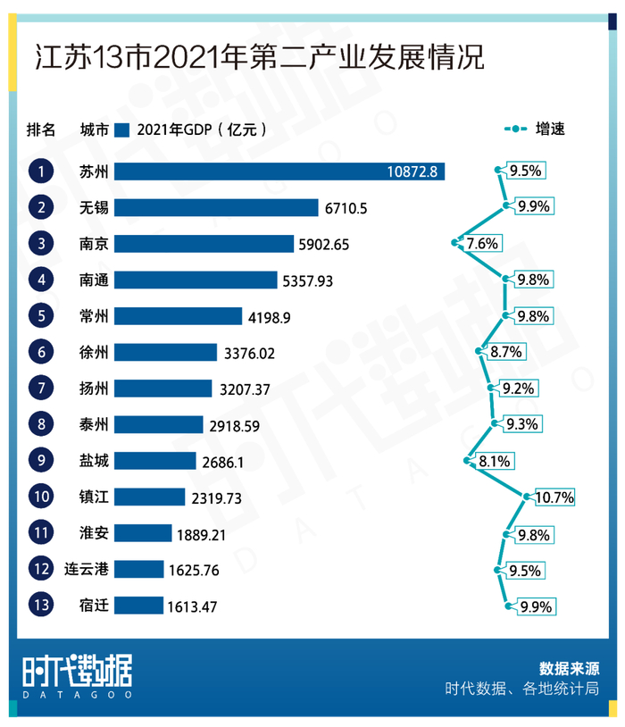 从第二产业增加值来看,苏州第二产业增加值达到10872.8亿元,领跑全省;无锡、南京、南通、常州分别以6710.5亿元、5902.65亿元、5357.93亿元、4198.9亿元的第二产业增加值分列二至五位。