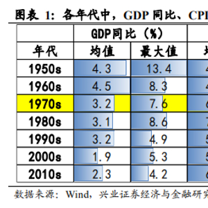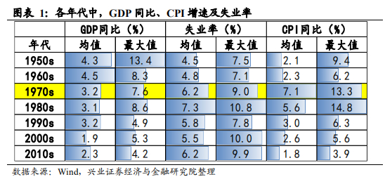 横向对比来看,“滞”与“胀”成为当时美国经济的两大关键词,低增长、高失业、高通胀是常态。1)低增长:1970年后美国经济扩张速度较过去20年明显放缓,GDP同比由4.5%边际降低至3.2%。尤其是,十年间美国经济增速三次跌入负区间,更是历史上从未有过的现象。2)高失业:70年代失业率较60年代显著攀升,十年间失业率从未低于5%,平均失业率达6.2%,仅次于80年代(80年代失业率激增主要受初期沃克治理恶性通胀,货币环境剧烈收紧、联邦基准利率升至20%以上、美国经济“W”形衰退的影响)。3)高通胀:70年代的通货膨胀水平为二战后来最高,10年间仅有3个月的CPI同比低于3%,平均CPI高达7.1%,较60年代上涨近5%。