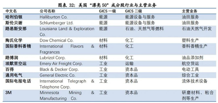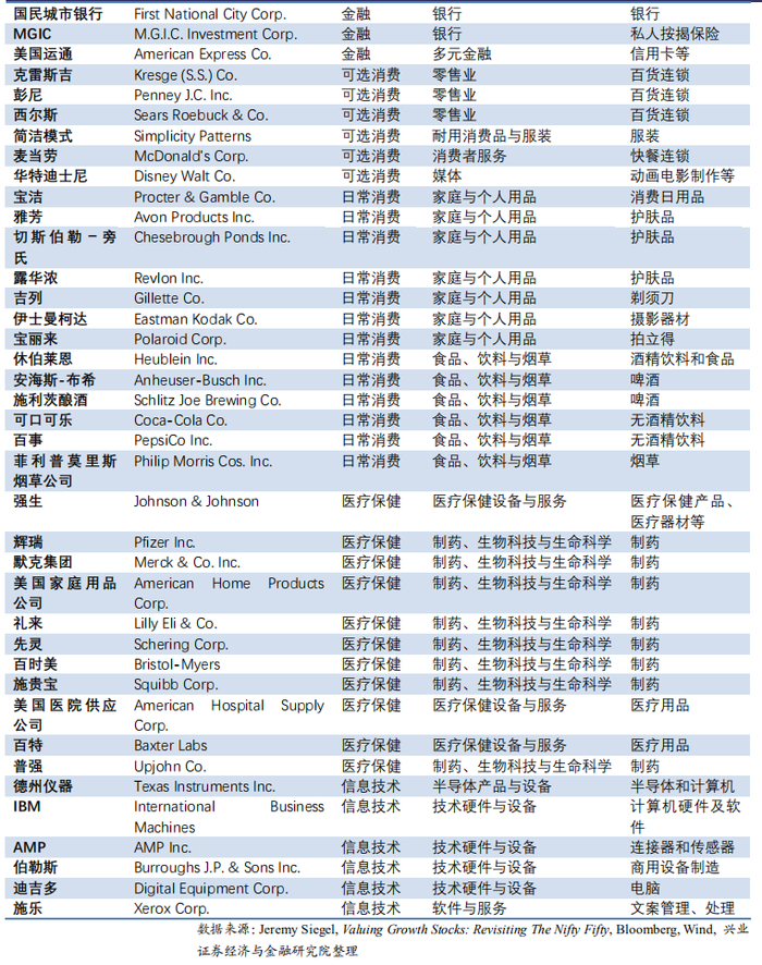 结合Jeremy Siegel的《Valuing Growth Stocks: Revisiting The Nifty Fifty》,我们首先整理出“漂亮50”的个股名单。从行业分布看,“漂亮50”的公司主要分布在消费、医药和信息技术等第三行业,日常消费、可选消费、医疗和信息技术个数分别为13、11、6、6家,四个行业个数占比超过70%。