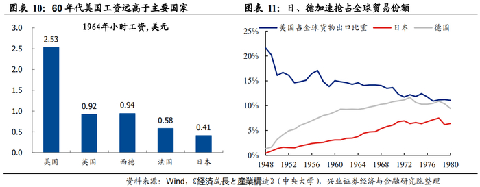 日、德完成产业转型,加速抢占全球贸易份额,进一步削弱美国经济增长动能。70年代,日本形成了以汽车、半导体等“高精尖”板块为核心的产业格局,并凭借高性价比逐步蚕食美国出口份额。1970年至1980年间,日本出口金额增速长期高于美国,由190亿美元上涨720%至1300亿美元,累计涨幅更是超出同期美国出口2倍以上。以汽车产业为例,汽油消耗低的日产汽车受到了全球消费者青睐,据纽约时报消息,70年代日本汽车出口翻了5倍至600万辆。激增的需求拉动日本汽车产量实现翻倍,而同期的美国汽车产量却零增长,此消彼长的结果即是日本于1978年取代美国成为世界头号汽车生产国。此外,该时期的美国出口金额增速显著低于进口,贸易顺差逐渐收窄、之后甚至转变为360亿美元的逆差。