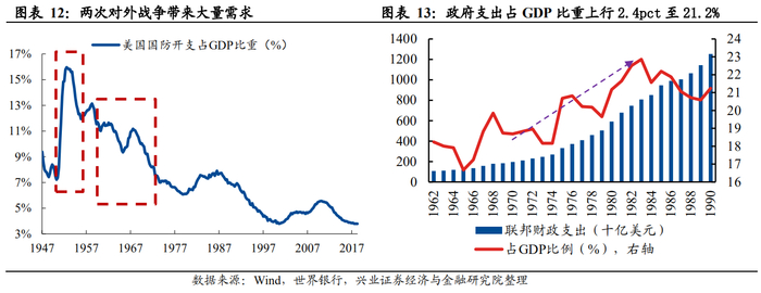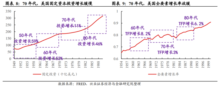 经济停滞乃至倒退的本质是投资和科技发展趋缓,70年代美国投资增速和全要素增长率增速较五六十年代大幅放缓。1)二战后,得益于马歇尔计划、滞后需求释放、婴儿潮及中产阶级成长等因素的支撑,美国经济一度高增速增长。尤其是对朝(1950-1953年)、越(美国参与的是1961-1973年,其中1965-1968年直接参战)两次战争叠加冷战背景,令美国始终保持着对军工品的旺盛需求,国防开支占GDP比重维持在高位,促进相关行业发展并成为拉动经济增长的重要力量。但到了60、70年代这些因素开始逐渐消失。整个1970年代,美国固定资产投资仅累计上涨11%,涨幅显著低于过去50%以上的水准。2)50、60年代,美苏围绕原子能技术、航天技术、电子计算机技术等高新技术展开竞争,开启人类第三次科技革命。但到了70 年代,以美国载人登月为标志,双方对于科技领域的投入开始减少,第三次科技革命的推动力阶段性减弱,十年间全要素增长率涨幅仅3%,显著低于50年代的18%和60年代的8.2%。