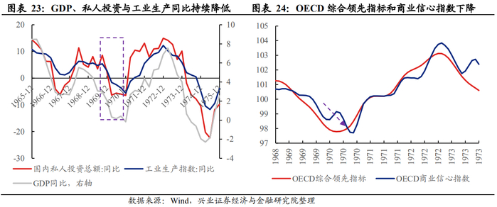 基本面:经济衰退大背景下,投资与工业生产全方位下滑,叠加美国入侵柬埔寨,削弱市场彼时的实际盈利以及对未来的盈利预期。GDP增速延续回落趋势并进一步下滑至0.1%-0.2%的水准;工业生产指数同比从1969年1.6%降至-2%;受利率大幅上行影响(1970年1月美联储宣布提高商业银行存款利率),投资意愿和需求降低,美国国内私人投资总额于1970Q1和Q2均录得-5.6%以下的负增速。此外,4月30日,尼克松宣布美国军队入侵柬埔寨,大规模的军费开支削弱市场对未来的经济预期,1970年上半年,OECD综合领先指标和商业信心指数的下滑趋势均指向经济增长的不确定性。