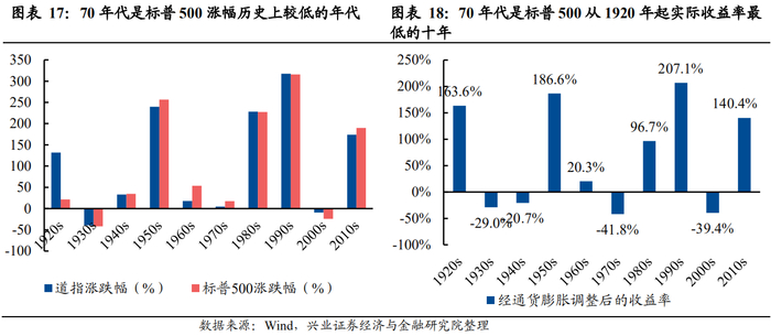 70年代的美股是1920年以来最差的年代。截止1979年12月31日,道指上涨4.8%,标普500上涨17.2%,70年代美股涨幅为1930s以来第三低,其累计涨幅仅高于包含大萧条时期的1930s年代和包含次贷危机的2000s年代。此外,如果考虑剔除通货膨胀后的实际收益率的话,70年代标普500的真实收益率为亏损41.8%,是1920年以来美股最差的十年。