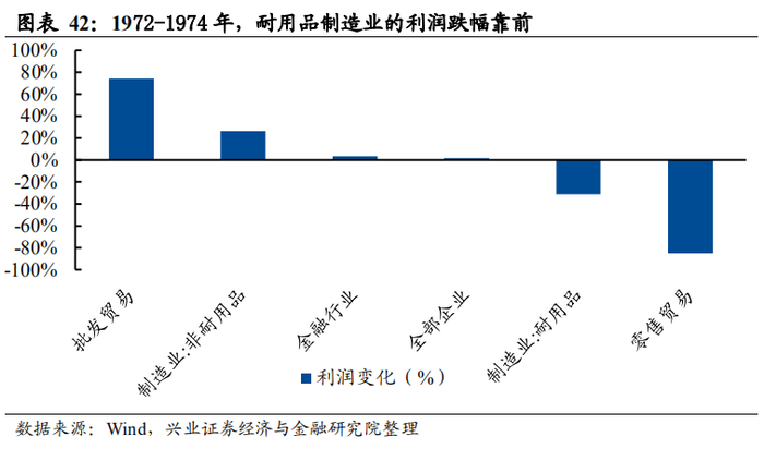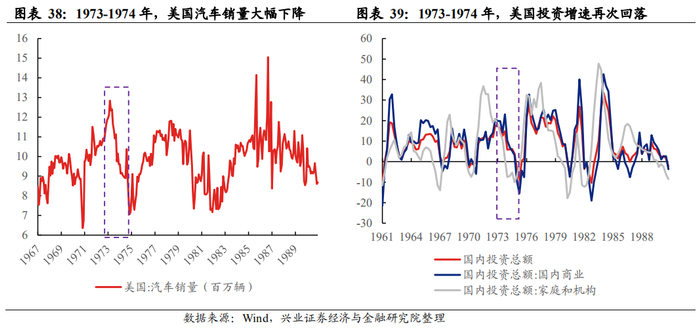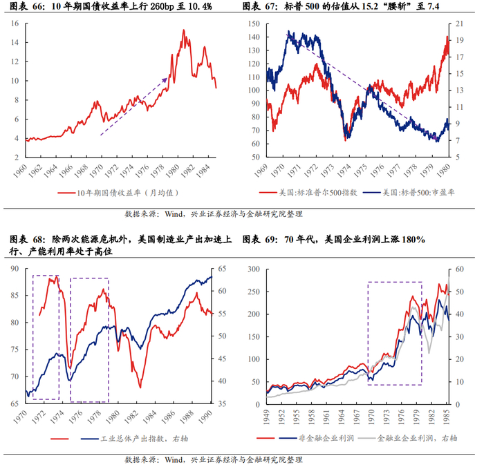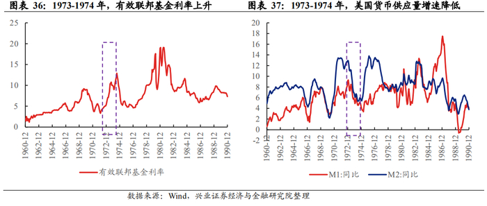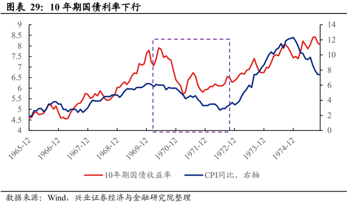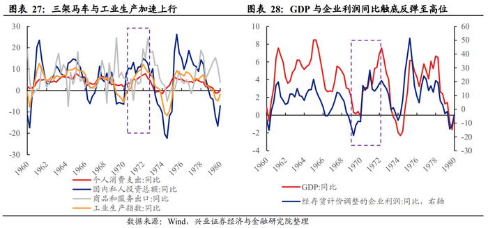 (2)1971Q1-1973Q1,经济增速快速反弹至7.56%的高位,失业率缓慢下行0.9pct;CPI同比持续降低1%左右,但4.6%的绝对值仍旧指向高通胀,此外,PPI同比涨幅达7.7个百分点,意味着工业品市场价格快速升温。