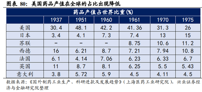 70年代政府加强对药物的限价,叠加日德等国家医药企业的崛起,美国医疗保健公司盈利能力受损,拖累行业下跌26.1%。分子端,1970年,尼克松上台后推出了《稳定法案》(EconomicStabilization Act of 1970)以实行价格和工资管制,据Coele和Sullivan的研究,这项法案严重挫伤行业内企业的利润空间;1972年,美国政府宣布废弃369种药品,进一步减少了药企的营收来源。此外,随着日本和德国经济和技术竞争力的提升,美国药企面临较大的挑战、市场份额出现下滑,美国药品产值占世界总产值的比重由1970年的31.3%下滑至1975年的26%。分母端,类似于科技股的逻辑,流动性收紧时期,估值处于高位的医疗股面临较大的回调压力。