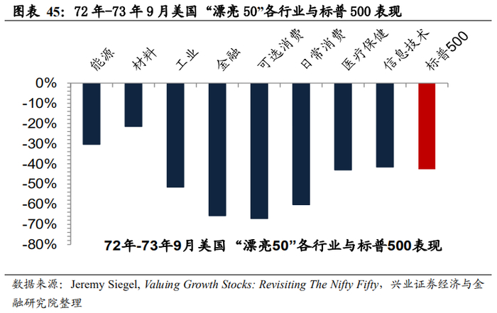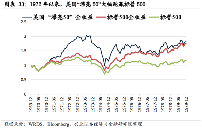 值得一提的是,在流动性大幅收紧、市场“杀估值”的背景下,前期被严重高估、泡沫最严重的“漂亮50”下跌最惨。从72年底市场高点到74年9月市场低点,美国“漂亮50”组合50只股票的算数平均跌幅是50%,同期标普500全收益指数下跌43%。