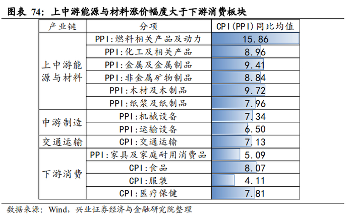 (1)价格传统机制不通畅:上中游能源与材料涨价幅度大于下游消费行业。70年代的通货膨胀是由外部黑天鹅事件冲击、使供给大幅收缩所造成的,属于成本推动型通胀,70年代美国的下游需求并不算很旺盛,所以偏下游的消费行业的涨价能力弱于上游能源和原材料行业,通过观察PPI和CPI分项同比之差,我们可以明显看出上游产品的涨价能力强于下游。